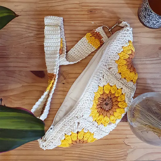 Ceux qui me connaissent le savent : je ne sors jamais sans une banane pour ranger mes affaires. C’est la raison pour laquelle il me fallait créer un design de banane au crochet ! J’ai donc imaginé ce modèle sur une base de granny squares en forme de tournesols : et voilà le travail !